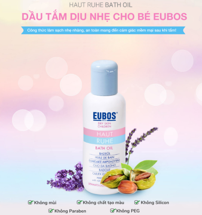 Dầu tắm dịu nhẹ cho trẻ Eubos được chiết xuất 100% dầu thiên nhiên và hoàn toàn không chứa chất gây hại cho làn da của bé yêu. Thông qua kiểm định từ Hội đồng da liễu Kiel, dầu tắm giúp giảm tình trạng kích ứng, mẩn đỏ, ngứa ngáy ở trẻ từ 6 tháng tuổi. Bên cạnh đó, tinh dầu hạnh nhân, ô liu, dầu oải hương giúp nuôi dưỡng làn da từ sâu bên trong. Do đó, da bé luôn trong trạng thái ẩm mượt, căng mịn, không bị khô ráp hay nhờn dính. Đồng thời, nhờ chiết xuất từ tinh dầu nguyên chất, dầu tắm Eubos tỏa hương thơm thanh mát, tự nhiên giúp bé thư giãn và nhanh chìm vào giấc ngủ.