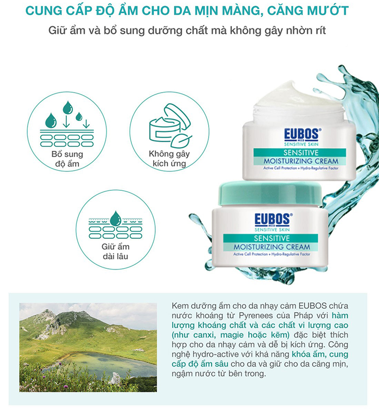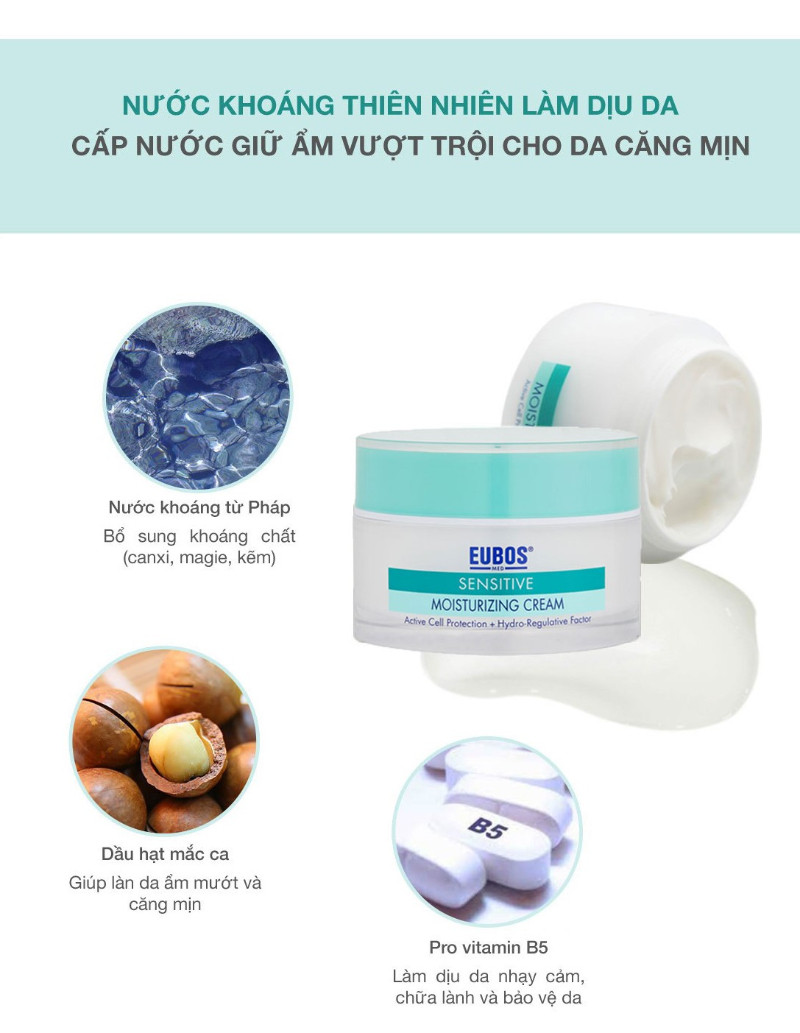 Có thể tham khảo về loại dưỡng ẩm cho da nhạy cảm EUBOS Sensitive Moisturizing Cream 50ml, làm dịu nhẹ chữa lành và bảo vệ da cùng Pro Vitamin B5 với những thành phần lành tính cho da mụn như nước khoáng thiên nhiên núi Pyrénées (Pháp): chứa hàm lượng khoáng chất và các chất vi lượng cao (canxi, magie, kẽm), dầu hạt mắc-ca giúp làn da ẩm mượt và căng mịn, Pro vitamin B5 (Panthenol) ,bơ hạt mỡ (shea butter), dầu hạt mắc-ca, dầu bơ cấp ẩm, làm mềm, tái tạo và bảo vệ da, ngăn ngừa nhờn và mụn.