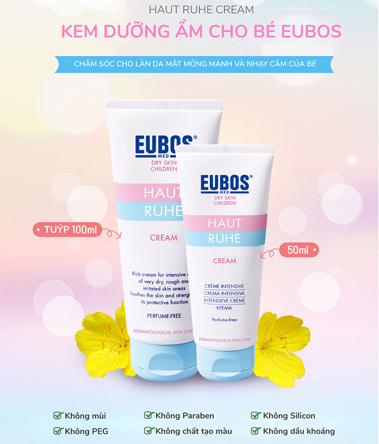 - Kem dưỡng da mặt cho bé EUBOS với 6% chiết xuất từ dầu hoa anh thảo, bổ sung lipit Omega-6 và Omega-3, dầu hoa oải hương, phức hợp vitamin, chiết xuất từ hạt chùm phỏng phù hợp để chăm sóc cho làn da nhạy cảm của em bé. Các thành phần tự nhiên giúp bảo vệ và phục hồi "sức đề kháng" cho da khi chúng bị suy giảm do viêm da cơ địa (chàm sữa) hoặc viêm da dị ứng.
