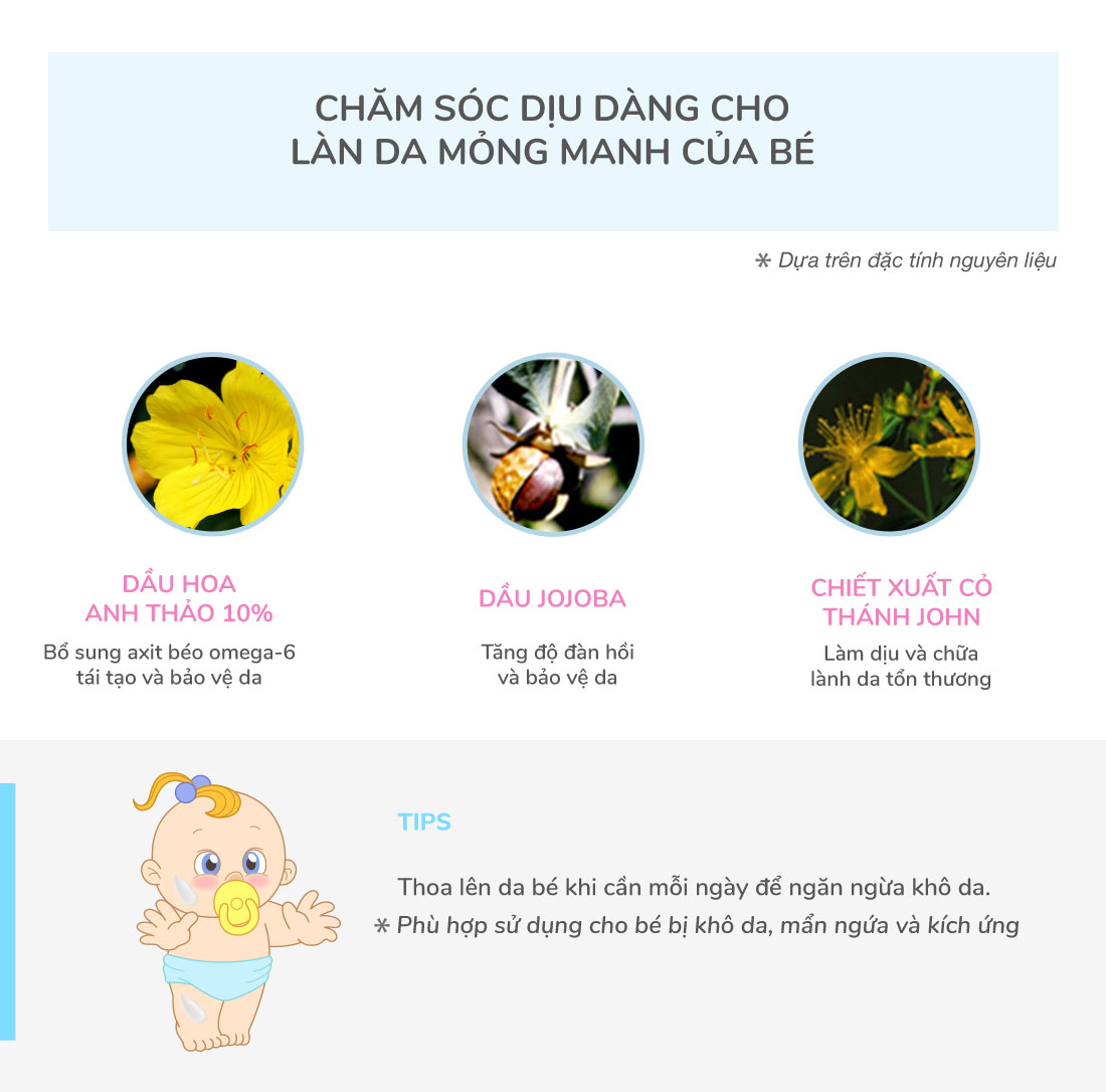Đặc biệt, kem nẻ cho bé của EUBOS còn chứa 10% tinh dầu hoa anh thảo quý giá với các axit béo thiết yếu như axit linoleic và axit gamma-linolenic - thành phần quan trọng trong tăng cường "sức đề kháng" của da. Sản phẩm đã được kiểm nghiệm lâm sàng an toàn để sử dụng cho làn da mỏng manh ở trẻ em và trẻ sơ sinh.
