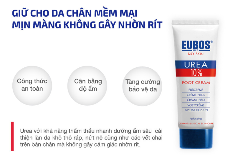 Nếu không có nhiều thời gian hoặc các phương pháp dưỡng da thiên tự làm tại nhà khiến bạn cảm thấy phức tạp thì thoa kem dưỡng da chân là cách điều trị đơn giản và nhanh nhất. Kem dưỡng da chân Eubos trị da chân khô, bong tróc, nứt nẻ hiệu quả bằng những thành phần thiên nhiên như bơ hạt mỡ, tinh chất Urea và dầu hạt mắc ca.